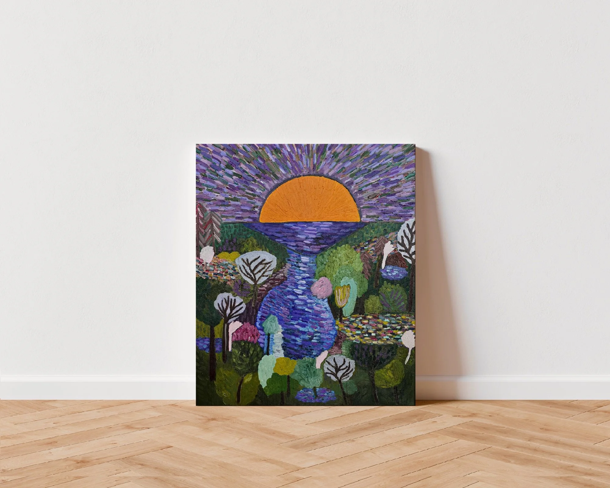 A glorious sun rising above the beauty of a natural forest and lake. A wonderful combinations of colours, patterns, shapes and sculptural brushstrokes create this imaginative and visually poetic landscape.